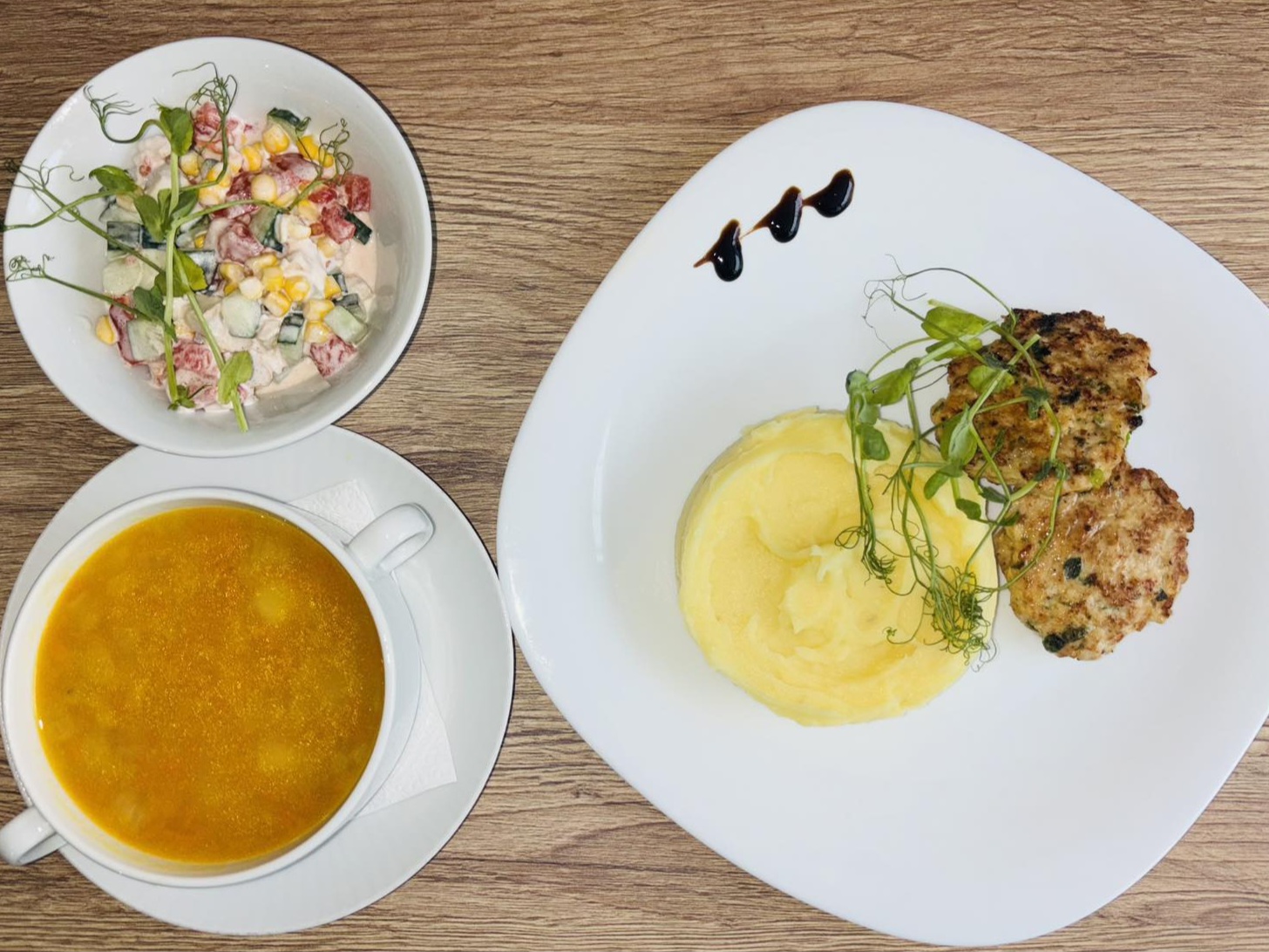 Салат "Поло" (150), суп гороховый (250), рубленые куриные котлеты (100), гарнир на выбор (рис, гречка, пюре картофельное) (150), морс ягодный (200), хлеб (2 шт.)