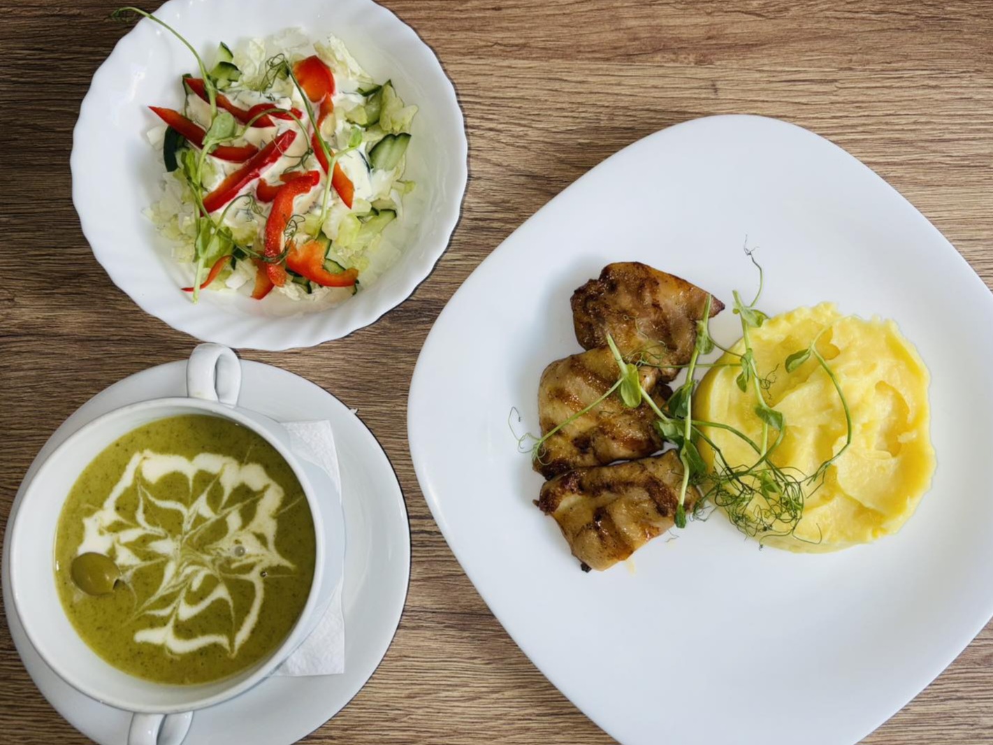 Салат овощной с греческим йогуртом (150), крем-суп (250), бедрышки куриные на гриле (100), гарнир на выбор (рис, гречка, пюре картофельное) (150), морс ягодный (200), хлеб (2 шт.)
